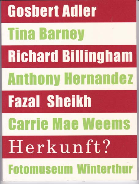Stahel, Urs [Herausgeber]: Herkunft? Gosbert Adler – Richard Billingham – Anthony Hernandez – Fazal Sheikh – Carrie Mae Weems. Erste Auflage. Winterthur. Fotomuseum Winterthur. 1996. 28 x 21 cm. 48 unpaginierte S. Illustrierter Okarton. Sehr gutes Exemplar. Katalog zur Ausstellung Winterthur 30. März bis 27. Mai 1996. Durchgehend mit Abbildungen versehen. Mit einem Essay von Villem Flusser.