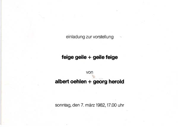 Oehlen, Albert + Georg Herold: feige geile + geile feige. von albert oehlen + georg herold.sonntag, den 7. märz 1982. Düsseldorf. Galerie Arno Kohnen. 1982. 10,5 x 14,8 cm. 4 S. OKarton-Klappkarte. Sehr gutes Exemplar. Einladung zur Gemeinschaftausstellung Oehlens und Herolds in der Galerie Arno Kohnen, wo gleichzeitig auch Vaclav Pozarek, Skulptur gezeigt wurde.
