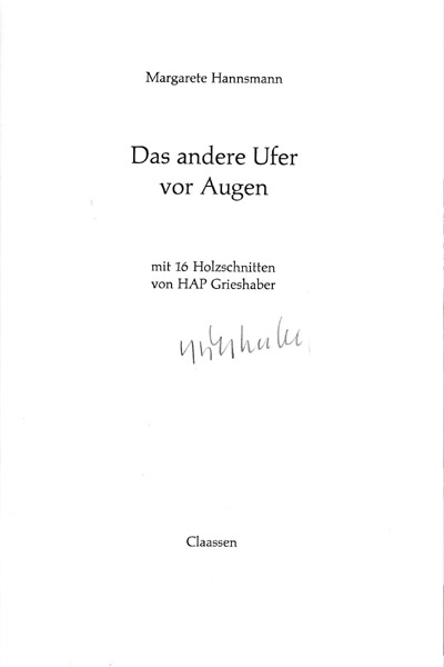 Hannsmann, Margarete: Das andere Ufer vor Augen. Mit 16 Holzschnitten von HAP Grieshaber. EA. (KLG) Hamburg/ Düsseldorf. Claassen Verlag. 1972. 24 x 16 cm. 111 S. Farbig illustrierte OSeide mit transparentem OCellophanumschlag. Der Umschlag mit einer größeren Fehlstelle. Sonst gutes bis sehr gutes Exemplar. Mit 16 farbigen (gold, Braun, ocker) vom Stock abgezogenen Original-Holzschnitten HAP Grieshabers sowie einem farbigen Einbandsiebdruck auf Honan-Seide. Von Grieshaber auf dem Titelblatt handschriftlich signiert.