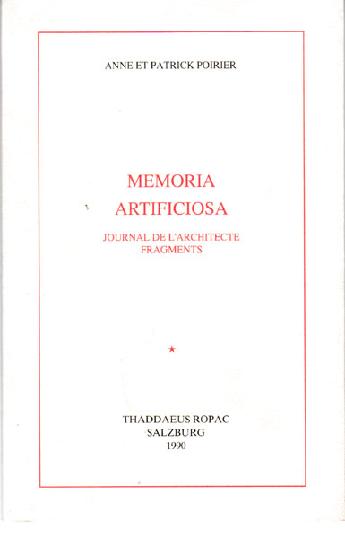 Poirier, Anne et Patrick: Memoria Artificiosa. Journal De L’Architecte. Fragments. Erste Auflage. Salzburg. Thaddaeus Ropac. 1990. 18 x 12 cm. 14 S. OBroschur mit OUmschlag. Sehr gutes Exemplar. Katalog zur Ausstellung Salzburg 1990 mit einer Abbildung sowie Text in französischer und deutscher Sprache versehen