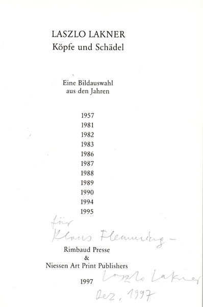 Lakner, Laszlo: Köpfe und Schädel. Eine Bildauswahl. Erste Auflage. Aachen/ Essen. Rimbaud Presse & Niessen Art Print Publishers. 1997. 30 x 23,5 cm. 68 unpaginierte S. OPappband. Einbandkanten mit kleinen Bereibungen. Sonst sehr gutes Exemplar. Durchgehend mit ganzseitigen farbigen Abbildungen versehen. Hier ein Exemplar ausserhalb der Nummerierung, jedoch mit eigenhändiger Zueignung des Künstlers auf dem Titelblatt.