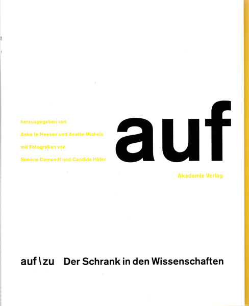 te Heese, Anke – Anette Michels [Herausgeber]: auf / zu. Der Schrank in den Wissenschaften. Erste Auflage. Tübingen. Berlin. Eberhard-Karls-Universität Tübingen. Akademie Verlag Berlin. 2007. 26 x 21 cm. 146 S., 2 Blatt. OKarton. Einbandkanten etwas nachgedunkelt und mit kleinen Bereibungen. Sonst gutes bis sehr gutes Exemplar. Erschienen anlässlich der Ausstellung Tübingen 24. Oktober 2007 bis 15. Februar 2008 durchgehend mit fotografischen Abbildungen von Candida Höfer und Simone Demandt mit Bildern von Schränken jedweder Art versehen.