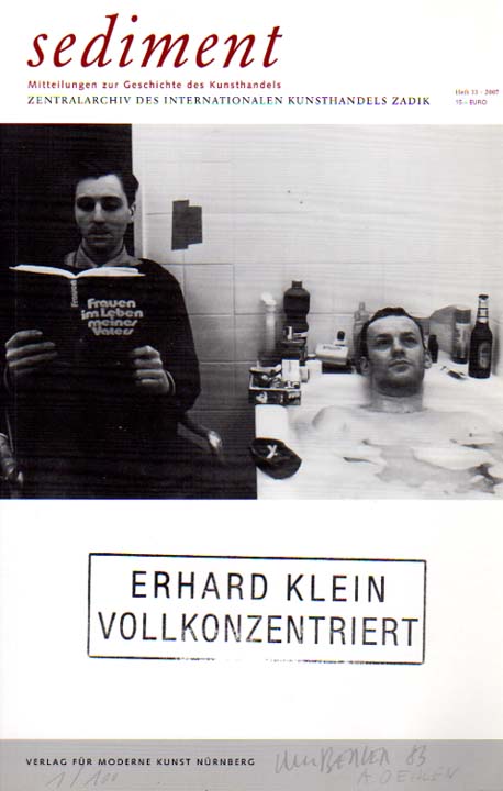 sediment. Mitteilungen zur Geschichte des Kunsthandels. Heft 13, 2007. Erhard Klein vollkonzentriert. Galerie Klein 1970 – 2006. Nürnberg. Verlag für moderne Kunst. 2007. 28 x 18 cm. 95 S. Illustrierter OKarton. Sehr gutes Exemplar. Sediment Heft 13. Zentralarchiv Des Internationalen Kunsthandels ZADIK. Mit Beiträgen von Günter Herzog, Heinz Holtmann, Carl Friedrich Schröer, Reiner Speck und einer Dokumentation von Brigitte Jacobs van Renswou. Durchgehend mit s/w Abbildungen versehen.