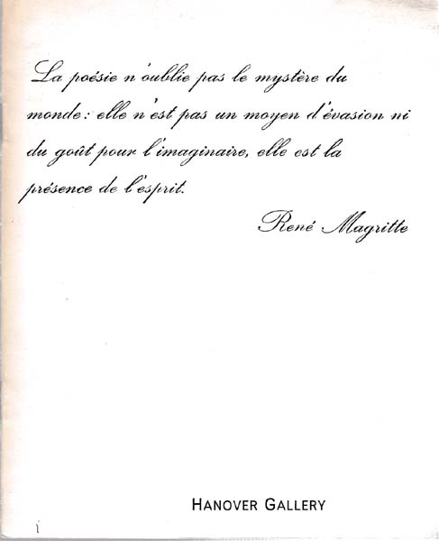 Magritte, René: Renè Magritte. Erste Auflage. London. Hanover Gallery. 1964. 23 x 18,5 cm. 20 unpaginierte S. OBroschur. Einbandkanten nachgedunkelt und mit kleinen Bereibungen. Sonst gutes bis sehr gutes Exemplar. Katalog zur Ausstellung London 14. Mai bis 10. Juli 1964. Durchgehend mit schwarz-weissen Abbildungen, sowie einem Werkverzeichnis versehen. Text in Englisch.