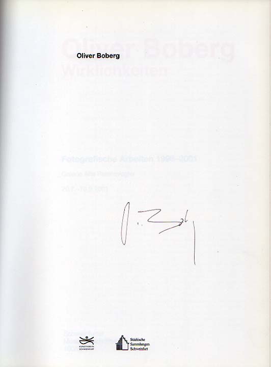 Boberg, Oliver: Wirklichkeiten. Fotografische Arbeiten 1998 – 2001. Galerie Alte Reichsvogtei, 20.7. – 16.9.2001. Erste Auflage. Schweinfurt. Städtische Sammlungen Schweinfurt. 2001. 28 x 22 cm. 41 S., 2 Blatt. OKarton. Sehr gutes Exemplar. Schweinfurter Museumsschriften ; 100/2001. Titel handschriftlich von Oliver Boberg in Kugelschreiber signiert. Mit einem Textbeitrag von Andreas Brandl in Deutsch und Englisch. Durchgehend mit Abbildungen von Farbfotografien versehen, teilweise auf Klapptafeln.