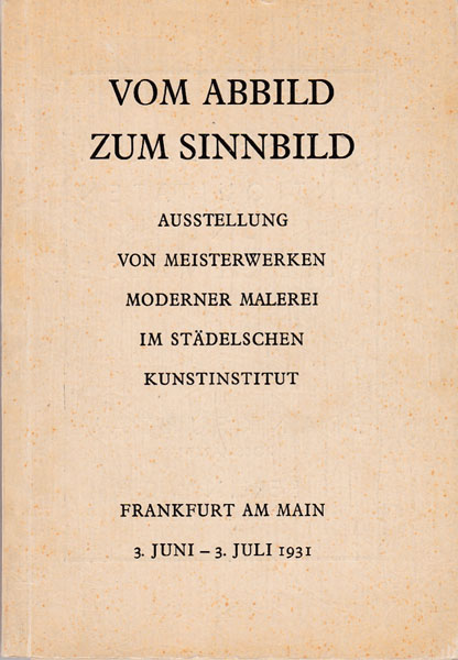 Vom Abbild zum Sinnbild. Ausstellung von Meisterwerken moderner Malerei im Städelschen Kunstinstitut. Erste Auflage. Frankfurt am Main. Städelsches Kunstinstitut. 1931. 21 x 14,5 cm 53 S., 1 Blatt, 16 Blatt Abbildungen (schwarz-weiss), 1 Blatt, 7 Blatt Anzeigenteil. OKarton. Einband stellenweise etwas aufgehellt, mit kleinen Fleckchen und Randbereibungen, insgesamt etwas angestaubt. Sonst noch gutes Exemplar. Katalog zur Ausstellung Frankfurt am Main 3. Juni bis 3. Juli 1931 mit zahlreichen Abbildungen sowie einem Verzeichnis der Bilder versehen. Ausgestellt wurden unter anderem Werke von Paul Cezanne, Ferdinand Hodler, Franz Marc, Paul Klee, Georges Braque und Fernand Leger. Inliegend Karte von Prof. Fritz Wichert und Flyer zu „Vom Abbild zum Sinnbild“, Graphik, Zeichnungen und Aquarelle.