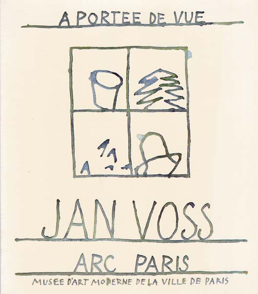 Voss, Jan: A portee de vue. Erste Auflage. Paris. ARC Paris/ Musee d’art moderne de la ville de Paris. 1978. 22 x 19 cm. 62 S., 1 Blatt. OKarton. Einbandkanten mit kleinen Bereibungen, etwas angestaubt. Gutes Exemplar. Katalog zur Ausstellung Paris 27. September bis 12. November 1978 durchgehend mit Abbildungen, Ausstellungsverzeichnis sowie Bio- und Bibliographie versehen. Text in französischer Sprache. Inliegend Einladungskarte zur Ausstellungseröffnung Jan Voss, Gelerie Lelong, 16. Novemer 1989 sowie Einladungskarte zur Vernissage der o.a. Ausstellung , Paris, 16. November 1989. Diese mit handschriftlichen Grußworten des Künstlers in Sprechplase aus dem „0“ des Namens heraus, das als Smiley ausgemalt ist.