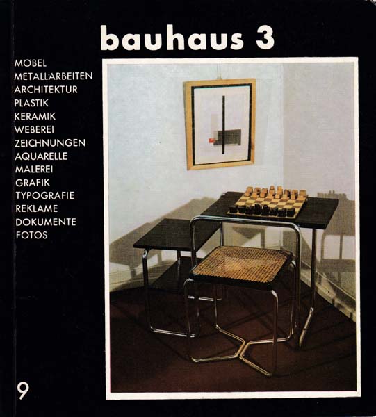 Möbel Metallarbeiten Architektur Platik Keramik Weberei Zeichnungen Aquarelle Malerei Grafik Typografie Reklame Dokumente. bauhaus 3. Erste Auflage. Leipzig. Galerie am Sachsenplatz. 1978. 23 x 21 cm. 100 S. Illustrierter OKarton. Einbandkanten mit kleinen Bereibungen, Rücken stellenweise minimal beschabt, Rückendeckel mit kleiner Knickfalte. Sonst gutes Exemplar. Erschienen zur Ausstellung Leipzig 18. 11. bis 23. 12 1978 durchgehend mit Abbildungen zu den genannten Bereichen versehen, darunter einige farbige.