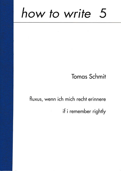 Schmit, Tomas: fluxus, wenn ich mich recht erinnere. if I remember rightly. Auflage 330 Exemplare. Berlin. Wiens Verlag. 2013. 24 x 17 cm. 29 S. OBroschur mit Leinenstreifenrücken. Vorderdeckel minimal nachgedunkelt. Sonst sehr gutes Exemplar. how to write 5. Hier die Nr. 222 von 330 nummerierten Exemplaren. Text in deutscher und englischer Sprache.