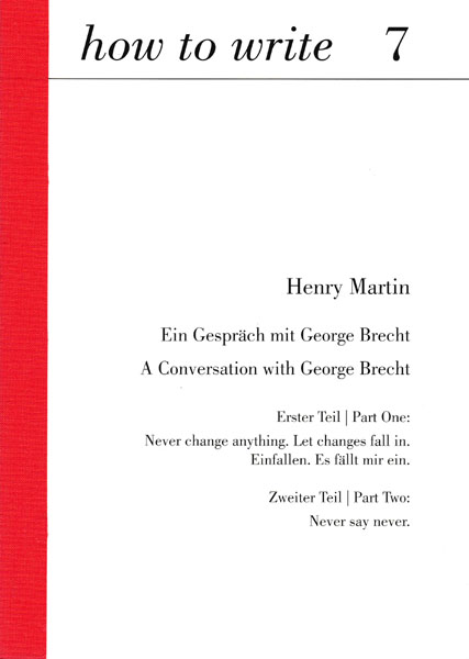 Brecht, George – Henry Martin: Ein Gespräch mit George Brecht. A Conversation with George Brecht. Erster Teil/ Part One: Never change anything. Let changes fall in. Einfallen. Es fällt mir ein. Zweiter Teil/ Part Two: Never say never. Auflage 330 nummerierte Exemplare. Berlin. Wiens Verlag. 2014. 24 x 17 cm. 47 S. OKarton mit Leinenstreifenrücken. Sehr gutes Exemplar. Hier die Nr. 115 von 300 nummerierten Exemplaren. Text in deutscher und englischer Sprache.