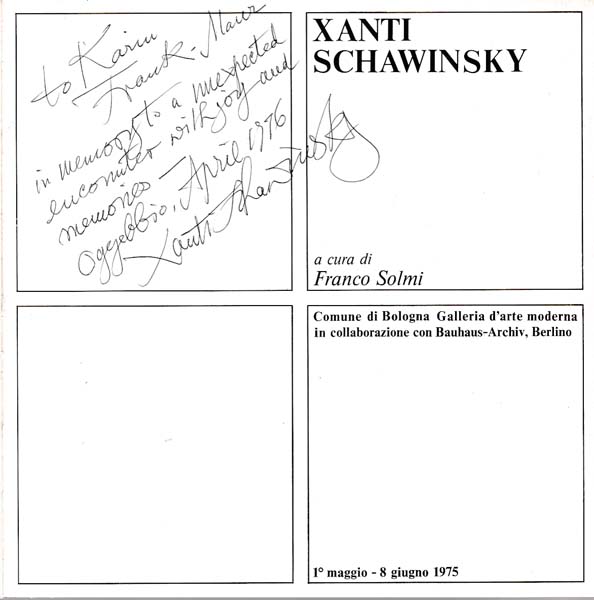 Schawinsky, Xanti – Franco Solmi: Xanti Schawinsky. Erste Auflage. Bologna. Galleria d’arte moderna Commune di Bologna. 1975. 20 x 20 cm. 117 S. OKarton. Einbandkanten mit kleinen Bereibungen, Rückendeckel stellenweuse etwas beschabt. Gutes Exemplar. Katalog zur Ausstellung Bologna 1. Mai bis 8. Juni 1975 durchgehend mit schwarz-weissen Abbildungen versehen. Text in italienischer Sprache. Mit eigenhändiger, mehrzeiliger Widmung des Künstlers an eine bekannte deutsche Kunsthistorikerin im vorderen Innendeckel!