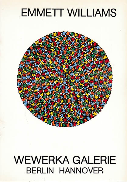 Williams, Emmett: Emmett Williams. Wewerka Galerie, Berlin, Hannover. Erste Auflage. Berlin, Hannover. Wewerka Galerie. 1986. 21 x 15 cm. 12 unpaginierte S. Illustrierter OKarton. Einband leicht berieben und nachgedunkelt, sonst gutes bis sehr gutes Exemplar. Erschienen anlässlich der Ausstellung bei Wewerka, Hannover, 1986. Durchgehend mit schwarz-weiß Abbildungen versehen. Mit eigenhändiger Zueignung des Künstlers auf dem ersten Blatt „for Armin with love,etc… Emmett Williams“