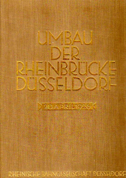 Umbau der Rheinbrücke Düsseldorf 20. April 1926. [Herausgegeben durch die] Rheinische Bahngesellschaft Düsseldorf. Erste Auflage. Düsseldorf. A. Bagel Verlag. 1926 33 x 24 cm. 35 S., 27 Tafeln. OLeinen. Sehr gutes Exemplar. Umfangreiche Dokumentation des Umbaus der ersten festen Rheinquere in Düsseldorf, eingeweiht 1898. Auf 27 ganzseitigen und qualitativ hochwertigen Fotoabbildungen sind die einzelnen Bauphasen des Umbaus dokumentiert. Mit 4 Beilagen von Zeitungsausschnitten.