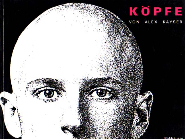 Kayser, Alex: Köpfe. Mit einem Nachwort von Richard Howard. Erste Deutsche Auflage Basel. Birkhäuser 1985 22 x 28 cm. 127 S. OKarton. Einband minimal lichtrandig, sonst gutes Exemplar. Kayser stellt in mehreren Fotoserien Porträts von Menschen verschiedener Herkunft vor, die alle eines gemeinsam haben: keine Kopfbehaarung. Interessante Porträtfolge vor tiefschwarzem Hintergrund.