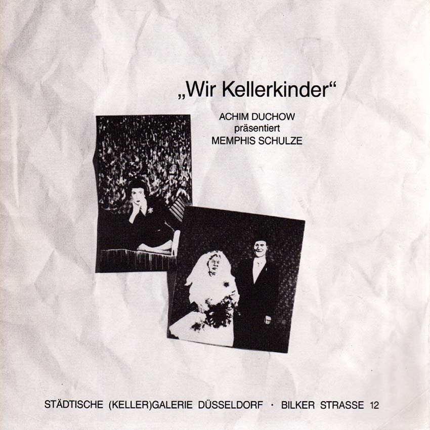 Wir Kellerkinder. ACHIM DUCHOW präsentiert MEMPHIS SCHULZE. Städtische (Keller)galerie Düsseldorf, 28.8.-22.9.1985. 1. Auflage. Düsseldorf. Städtische (Keller)galerie. 1985. 20 x 20 cm. 16 unpaginierte S. OKarton. Umschlag minimal lichtrandig, sonst gutes Exemplar. Mit Textbeiträgen von Achim Duchow und Thomas Koch. Durchgehend mit schwarz-weiß Abbildungen versehen.