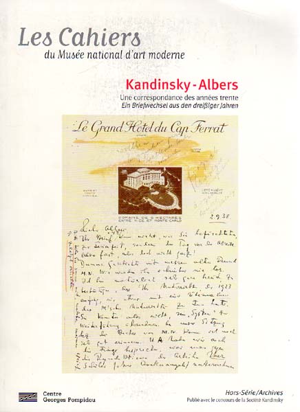 Kandinsky, Wassily: Kandinsky – Albers. Une correspondance des années trente / Ein Briefwechsel aus den dreißiger Jahren. Erste Auflage. Paris. Éditions du Centre Pompidou. 1998. 26 x 19 cm. 159 S. Illustrierter OKarton. Einbandkanten leicht knittrig und berieben, vorderer Deckel fleckspurig. Sonst gutes Exemplar. Spezialausgabe der Reihe Cahiers du Musée National d’Art Moderne. Text verfasst und kommentiert von Jessica Boissel. Übersetzung des deutschen Textes von Jeanne Etoré. Durchgehend mit überwiegend schwarz-weiß Abbildungen versehen.