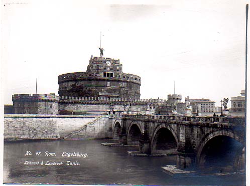 Lehnert & Landrock: Engelsburg – Rom. 13,5 x 18 cm. Von sehr guter Erhaltung auf festem Fotokarton. Kontaktabzug 18x13,5 cm mit einbelichteten Zuschreibungen unten links; Rom (Nr. 47) – Die Engelsburg mit Tiberbrücke: Lehnert & Landrock. Tunis. Die Aufnahme entstand wohl um 1910, die Kontaktabzüge vermutlich etwas später. Bild von guter Qualität, der Abzug selber eher lässig entwickelt mit etwas ausweichendem Silber und den mitbelichteten Kontaktrahmen.