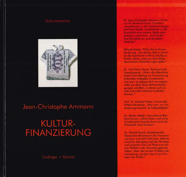 Ammann, Jean-Christophe [Herausgeber]: Kultur-Finanzierung. Dokumentation des Symposiums zur ART FRANKFURT 1995. Erste Auflage. Regensburg. Lindinger + Schmid Verlag. 1995. 20,5 x 21,5 cm. 113 S., 1 Blatt. Illustrierter OPappband. Sehr gutes Exemplar. Reihe Dokumentation D 2.