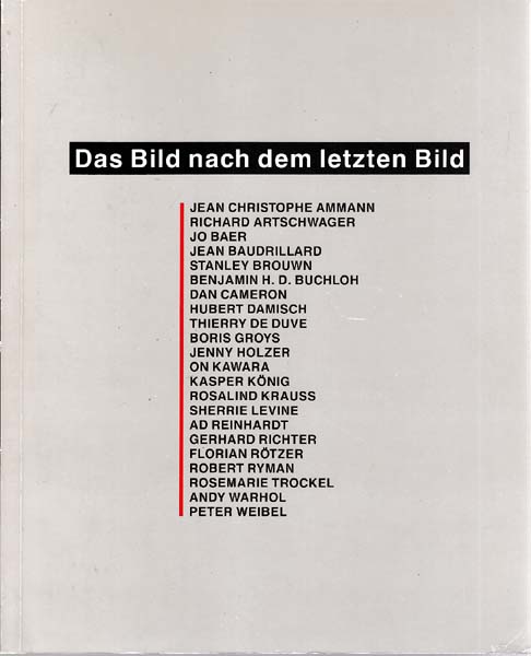 Weibel, Peter – Christian Meyer [Herausgeber]: Das Bild nach dem letzten Bild. The Picture After the Last Picture. Erste Ausgabe. Köln. Buchhandlung Walther König. 1991. 25 x 21 cm. 258 S. Illustrierter OKarton. Einband berieben, etwas unfrisch, Einband an den Stoßkanten etwas gestaucht, sonst gutes Exemplar. Erschienen anlässlich der Ausstellung – Das Bild nach dem letzten Bild in der Galerie Metropol, Wien. Es haben folgende Künstler / innen teilgenommen: Jean Christophe Ammann, Hubert Damisch, Jenny Holzer, On Kawarar, Gerhard Richter, Rosemarie Trockel und Andy Warhol u.a. Texte in Deutsch und Englisch.