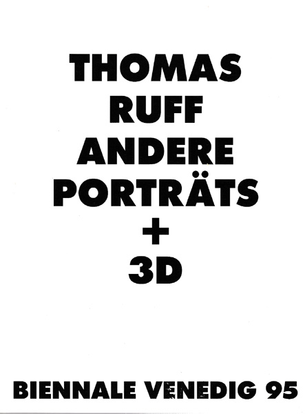 Ruff, Thomas: Andere Porträts + 3D. Ostfildern. Cantz Verlag. 1995. 28 x 21 cm. 57 S. 1 Bl. OKarton. Kleine Drucklstelle an der oberen Kante, sonst sehr gutes Exemplar. Erschien als Katalog zur Biennale Venedig 1995. Mit meist ganzseitigen schwarz-weiss Fotoabbildungen.