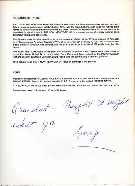 Sugarman, George: Art Now: New York. Volume 1, Number 1, January 1969 / Volume 1, Number 3, March 1969. 2 Hefte. New York. University Galleries. 1969. 28 x 21 cm. 6 S., 5 lose Tafeln; 6 S., 5 lose Tafeln. OKarton-Folder. Heft 1 im oberen Rand lichtrandig und angestaubt sowie mit Kugelschreibermarkierung auf dem Umschlag. Sonst sehr gutes Exemplar. Das erste und dritte Heft des 1969 gegründeten Magazins zur aktuellen Kunst der Stadt New York in Ateliers, Museen und Galeriene. Heft 1 ausf der hinteren Inenklappe mit kurzer handschriftlicher Zueignung von George Sugarman, „a new sheet – Thought it might interest you“, signiert „George“. Das Heft enthält Beiträge zu Donald Judd, Alexander Liberman, Roy Lichtenstein, DSennis Oppenheim und George Sugarman. Heft 2 enthält Briträge zu Willem de Kooning, Dan Flavin, Helen Frankenthaler, Rober Indiana und Barnett Newman. Mit jeweils 5 Farbtafeln zu aktuellen Arbeiten der Künstler sowie Kurzvorstellungen. Die beiden Hefte wurden durch George Sugarman dem hier nicht namentlich genannten Galeristen Alfred Schmela zugesandt. Beiliegend eine Viristengarte von Wiloughby Sharps New Yorker Kineticism Press. [Provenienz: Nachlass der Galerie Schmela].
