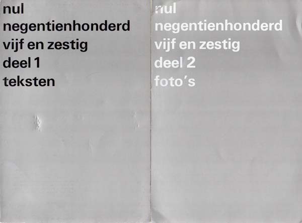 nul. negentienhonderd vijf en zestig. del 1: teksten. deel 2: foto´s. Stedelijk Museum 15 April – 8 Juni 1965. 1. Auflage. 2 Bände. Amsterdam. Stedelijk Museum. 1965. 28 x 19 cm. 28, 32 unpaginierte S. OKarton (gelumbeckt mit dünnem Leinenstreifen, ohne Rücken). Leichte Druckstellen am Umschlag, etwas angestaubt, geringe Gebrauchspuren. Gutes Exemplar. Austellungsprojekt um die Zero nahestehende Gruppe Nul mit Armando, Henk Peeters und Jan Schoonhoven. Mit Werkabbildungen oder Texten von und über Mack, Piene, Uecker, Bury, Arman, Yves Klein, Manzoni, Rickey, Soto, Castellani und anderen. Band 1 Texte in Deutsch, Holländisch, Englisch und Französisch, Band 2 mit 98 abgebildeten Werken auf Fotos. [Vgl. Dirk Pörschmann. ZERO. 2015, S. 151].