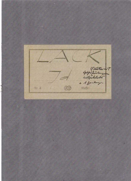 Schlemmer, Oskar: Lack. Erscheint anläßlich der Ausstellung „Das Lackkabinett“ im Kunstverein für die Rheinlande und Westfalen, 22.10.-6.12.1987. Auflage 1500 Exemplare. Düsseldorf. Kunstverein für die Rheinlande und Westfalen. 1987. 21 x 14,5 cm. 36 unpaginierte S. OKarton. Sehr gutes Exemplar. Faksimile eines Schulheftes mit Skizzen und Zeichnungen Schlemmers aus dem Jahr 1942. 1 von 1500 Exemplaren.