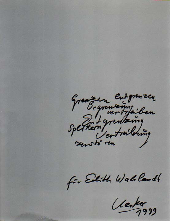 Uecker, Günther: Entgrenzung. Vertreibung. Galerie Edith Wahlandt.20. November 1999 bis 19. Februar 2000. Auflage: 1000 Exemplare. Stuttgart. Galerie Edith Wahlandt. 1999. 27 x 21 cm. 53 S. 1 Blatt. OKarton mit OKlappenumschlag. Sehr gutes Exemplar. Nagelarbeiten und Zeichnungen aus 1999.