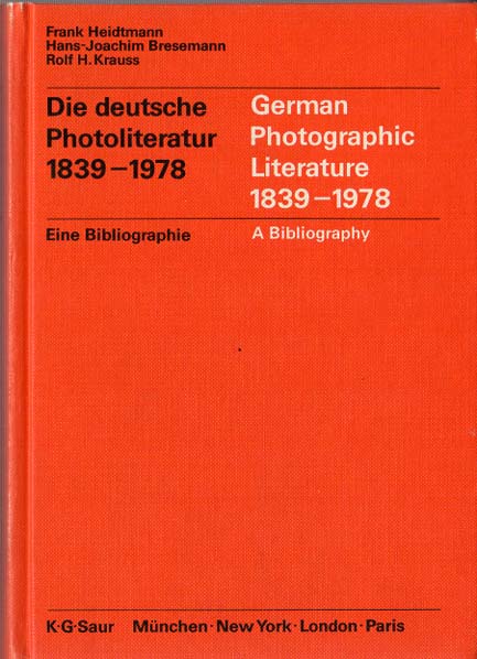 Heidtmann, Frank / Bresemann, Hans-Joachim / Krauss, Rolf H.: Die deutsche Photoliteratur 1839 – 1978. German Photographic Literature 1839 – 1978. Theorie, Technik, Bildleistungen. Eine systematische Bibliographie der selbständigen deutschsprachigen Photoliteratur. Theory – Technology. Visual. A classified bibliography of German-language photographic publications. 1. Ausgabe. München /New York / London / Paris. K. G. Saur. 1980. 690 S. Illustrierter OPappband. Winziger Fleck auf Deckel recto. Einband minimalst angestaubt und geringfügig berieben. Kleines Namenskürzel auf Innendeckel vorne, sonst gutes Exemplar. Schriftenreihe der Deutschen Gesellschaft für Photographie e.V.; Band 1. Ohne Abbildungen, wie erschienen. Immer noch maßgebliche Bibliographie in der ersten Auflage.