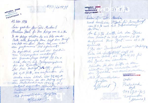 albrecht/d [d. i. Dietrich Albrecht]: 2 handschriftliche Briefe an Dr. Axel Hinrich Murken. jeweils 29,6 x 20,9 cm. 2 Blätter. Zum Versand gefaltet, eine Seite gelocht, sonst gute Exemplare. Handschriftliche Briefe auf der Rückseite des Briefpapiers der „reflection press“ (Stuttgart) in blauer Füllertinte: 23 Zeilen, datiert 21. Februar 1976, signiert und datiert sowie 25 Zeilen, datiert 15.4.76, signiert und datiert. Jeweils gestempelt „reflection press. albrecht d. Friedenaustr. 21. 7 Stuttgart 1“. An den Arzt, Sammler und Kunsthistoriker Axel Hinrich Murken. Dietrich Albrecht, auch Albrecht/d. (* 21. April 1944 in Nordhausen in Thüringen; † 12. Februar 2013 in Stuttgart) war ein deutscher Künstler des Fluxus, der Mail Art, der Aktionskunst und anderer avantgardistischer Kunstformen seit den 1970er Jahren (Wikipedia). Im Schreiben vom 21. Februar bietet Albrecht eine Edition an und erwähnt die Zahlungsmodalitäten, im zweiten Schreiben erinnert er Murken an eine verabsäumte Zahlung.