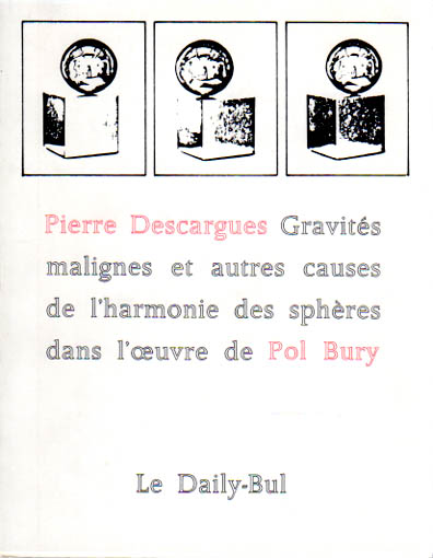 Bury, Pol – Pierre Descargues: Gravités malignes et autres causes de l´harmonie des sphères dans l´oeuvre de Pol Bury. La Louviére. Le Daily-Bul. 1980. 18 x 14 cm. 100 unpaginierte S. OKarton mit illustriertem OUmschlag. Umschlagkanten nachgedunkelt und etwas berieben. Gutes Exemplar. (Französischer) Text von Pierre Descargues mit zahlreichen s/w Arbeiten von Pol Bury. Exemplar 311 von 1000 nummerierten Exemplaren.