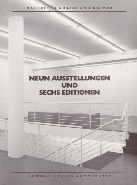 Bugdahn, Udo [Herausgeber]: Neun Ausstellungen und sechs Editionen. Sommer 1992 bis Sommer 1994. Auflage: 2000 Exemplare. Düsseldorf. Galerie Bugdahn und Kaimer. 1994. 24 x 18 cm. 39 S. Illustrierter OKarton. Sehr gutes Exemplar. Dokumentiert die Ausstellungen und Editionen der Galerie von 1992 bis 1994, darunter Jürgen Klauke, Mic Enneper, Peter Hutchinson. Durchgehend mit farbigen Abbildungen versehen.
