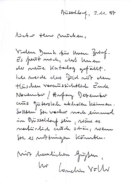 Völker, Cornelius: Handschriftlicher, einseitiger Brief nebst handschriftlich adressiertem Briefumschlag. [Autograph]. Düsseldorf. 1997. 29,7 x 21 cm. 1 S. Papier. Sehr gutes Exemplar. Einseitiger 15-zeiliger, handschriftlicher Brief von Cornelius Völker auf neutralem Briefpapier in schwarzer Tinte an einen deutschen Kunsthistoriker, Sammler und Ausstellungsmacher nebst handschriftlich adressiertem Briefumschlag (postalisch gelaufen). Im Brief verweist Völker auf die Abholung eines Bildes von einer Ausstellung in Gütersloh.