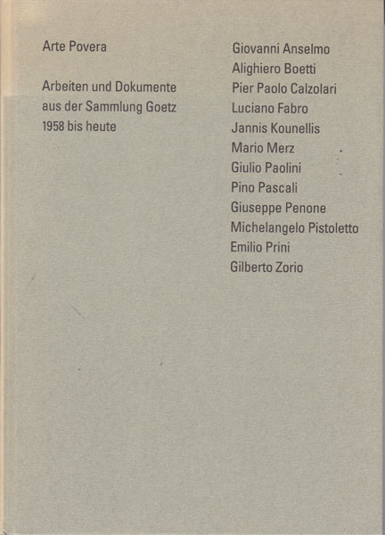 Arte Povera. Arbeiten und Dokumente aus der Sammlung Goetz 1958 bis heute. Giovanni Anselmo, Alighiero Boetti, Pier Paolo Calzolari, Luciano Fabro, Jannis Kounellis, Mario Merz, Giulio Pascali, Giuseppe Penone, Michelangelo Pistoletto, Emilio Prini, Gilberto Zorio. Neues Museum Weserburg, Bremen, 22. Juni bis 7. September 1997.[und weitere Stationen]. 1. Auflage. Bremen. Neues Museum Weserburg. 1997. 24,5 x 17 cm. 246 S., 1 Blatt. OPappband. Einband im vorderen oberen Rand etwas aufgehellt. Gutes Exemplar. Textreiche Dokumentation der italienischen Arte Povera mit zahlreichen Abbildungen.