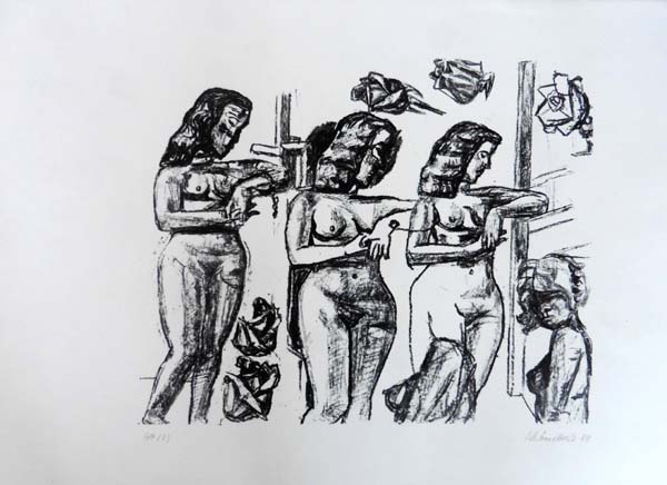 Schönebeck, Eugen: Grazien. 1 Blatt. Marginale Druckstellen im Papier. Sehr gutes Exemplar. Lithographie auf Bütten, 31 x 38 cm (Blatt 59,0 x 42,5 cm), unten links nummeriert 40 / 63 Exmplaren, unten rechts signiert und datiert 1969. Vier weibliche Vollakte und ein seitlicher Halbakt.