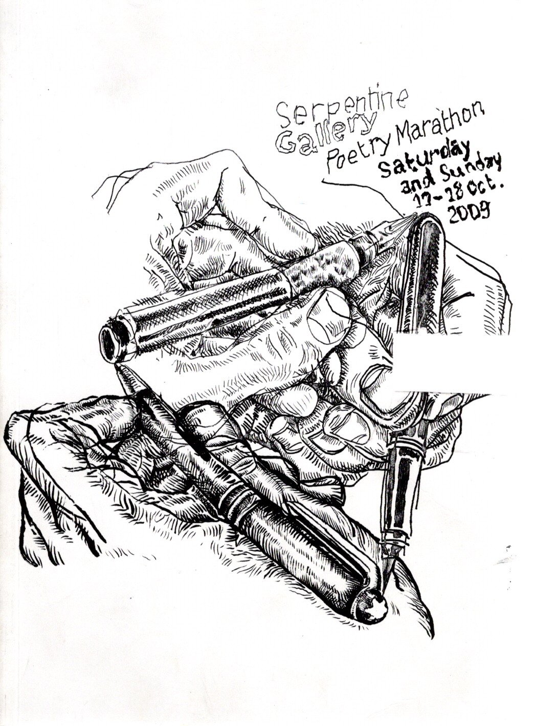 Serpentine Gallery Poetry Marathon. Saturday and Sunday 17-18 Oct 2009. Erste Auflage. Köln / London. Verlag der Buchhandlung Walther König / Koenig Books Ltd. 2012. 24,5 x 17,5 cm. 612 S. Illustrierter OKarton mit herausgestanzten Blockseiten. Stoßkanten und Kapitale leicht berieben und bestoßen, Einband insgesamt minimal angestaubt und fleckig. Sonst gutes Exemplar. Erschienen anlässlich der Ausstellung der der Serpentine Gallery in London vom 17. – 18. Oktober 2009, mit Auftritten führender Dichter, Schriftsteller, Künstler, Philosophen, Gelehrter und Musiker. U.a. mit Sean Bonney, Tracey Emin, Brian Eno, James Fenton, Gilbert & George, John Giorno, Dominique Gonzalez-Foerster, Kenneth Goldsmith, Eugen Gomringer, Richard Hell, Geoffrey Hill, Joan Jonas, August Kleinzahler, Nick Laird, Sean Landers, Jonas Mekas, Maria Mirabel, Eileen Myles, Philippe Parreno, Holly Pester, Jeremy Reed, Gerhard Rühm, Barry Schwabsky and Agnès Varda, uvw. Durchgehend mit schwarz-weiß Abbildungen innerhalb der englischen Texte versehen.