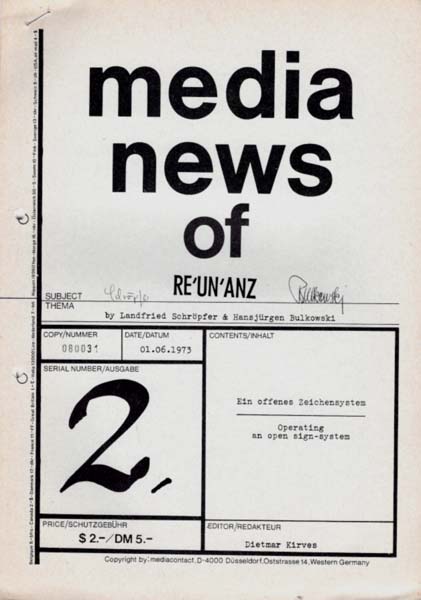 Schröpfer, Landfried & Hansjürgen Bulkowski: Reunanz. Ein offenes Zeichensystem. Operation an open sign-system. media news [Heft] 2, 01.06.1973. Herausgegeben von Dietmar Kirves. Düsseldorf. Mediacontact Dietmar Kirves. 1973. 31 x 22 cm. 18 S. Gehefteter Karton. Umschlag etwas lichtrandig. Gutes Exemplar. Von Landfried Schröpfer und Hansjürgen Bulkowski handschriftlich auf Titelblatt signiert. Mit Abbildungen der Objekte, die sich auf „Reunanz“ beziehen.