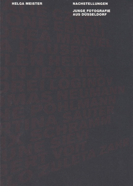 Meister, Helga: Nachstellungen. Junge Fotografie aus Düsseldorf. Ausstellung in der halle 6 – galerie christine hölz, Düsseldorf. Erste Auflage. Düsseldorf. Galerie Christine Hölz. 2004. 24 x 17 cm. 127 S. OKarton mit OKlappenumschlag. Sehr gutes Exemplar. Junge Fotografen in Düsseldorf nach der Becher Klasse, u.a. Natalie Czech, Simone Eberli, Andrea Mantel, Tina Hauser, Katlen Hewel, Yoon-Jean Lee, Andrei Loginov, Thomas Neumann, Anne Pöhlmann, Martina Sauter, Felix Schramm, Sigune Sievi, Robert Voit, Pablo Zuleta Zahr. Mit zahlreichen Farbabbildungen. Auflage 1500 Exemplare.