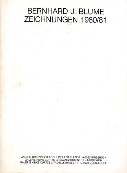 Blume, Bernhard J. / Gerhard Rühm: Zeichnungen 1980/81. Kant zuliebe. Galerie Krinzinger, Innsbruck / Galerie Heike Curtz, Wien – Düsseldorf. 1. Auflage. Innsbruck. Wien. Düsseldorf. Galerie Krinzinger / Galerie Curtze. 1981. 29 x 21 cm. 44 unpaginierte S. OKarton. Einband berieben und etwas unfrisch, sonst gutes Exemplar. Doppelkatalog, über Kopf gebunden.