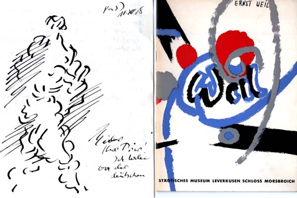 Weil, Ernst: München – Paris. Städtisches Museum Leverkusen, Schloss Morsbroich, 22. Januar bis 1. März 1959. Erste Auflage. Leverkusen. Städtisches Museum Leverkisen Schloss Morsbroich. 1959. 26 x 19 cm. 32 unpaginierte S. OKarton. Name des Künstlers handschriftlich auf dem Umschlag, sonst gutes Exemplar. Mit einem Text von Guy Weelen und 21 abgebildeten Arbeiten sowie einem Porträtfoto. Eine handschriftliche Ergänzung im Ausstellungsverzeichnis durch den Künstler. Beiliegend ein dreiseitiger handschriftlicher Brief in schwarzer Tinte, datiert Paris 18.XII. 58 an einen ehemaligen deutschen Kunsthistoriker, der sich um eine wirtschaftliche Unterstützung des Malers in Paris bemüht hatte. Der Brief ist eingeleitet mit einer ganzseitigen Zeichnung in der Weil typischen Art einer komponierten Figur aus Bögen und Strichen. 2 Blatt, 27 x 21 cm, drei Seiten beschrieben.