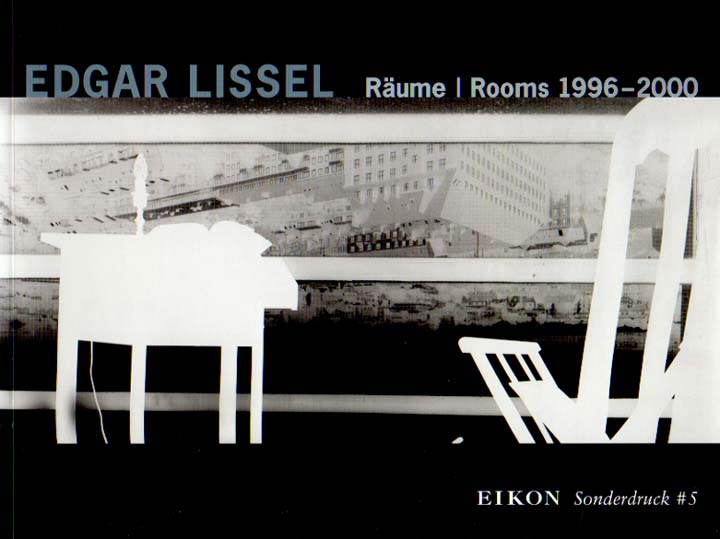 Lissel, Edgar: Räume / Rooms. 1996-2000. Räume – Fotografische Dekonstruktionen 1996-1997 – Räume aus Glas 1998-2000. Städtische Galerie Villa Zanders Bergisch-Gladbach, 19. November 2000 bis 21. Jänner 2001. Erste Auflage. Wien. Eikon. 2000. 21 x 28 cm. 48 S. OKarton. Gutes Exemplar. Eikon Sonderdruck 5. Texte in Deutsch und Englisch. Mit Beiträgen von Wolfgang Vomm und Gerhard Graulich. Durchgehend mit s/w Abbildungen versehen.