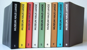 Ringbuch 8b Nestler, Wolfgang – Robert Rauschenberg – Hans Arp – Mel Ramos – Mark Tobey: Ringbuch 8. Museum Haus Lange, Krefeld, 28. September 1974 bis 3. August 1975. 1. Auflage. Krefeld. Museum Haus Lange. 1974/1975. 31 x 25 cm. Ca. 100 unpaginierte S. Plastik – Ringbuch, schwarzer Rückentitel. Der Ordner entspricht nicht dem vorgesehenen, es ist der für Nummer 2 in Gelb, nicht der für Nummer 7 in Braun. Sonst aber sehr gutes Exemplar. Vollständiger Jahrgang der Kataloge des Museum Haus Lange von September 1974 bis August 1975, als Ringbuch 8 herausgegeben. In der Reihenfolge der Einlagen: Wolfgang Nestler. Plastik als variables System. 29. September bis 17. November 1974. Deckblatt, 2 S. Text Gisela Fiedler, 18 Tafeln, 1 S. Biographie, Ausstellungsdokumentation; Robert Rauschenberg. Steinerner Mond. 1. Dezember 1974 bis 19. Januar 1975. Einladung, Deckblatt, 2 S. Text Paul Wember, 18 Tafeln (teils Klapptafeln), 2 S. Biographie, 4 S. Ausstellungsdokumentation, blanko; Hans Arp. Skulpturen. 2. Februar bis 31. März 1976. Deckblatt, 2 S. Text Paul Wember, 8 Tafeln, 4 S. Austellungsverzeichnis und Biographie, 8 S. Ausstellungsdokumentation, blanko; Mel Ramos. Sammlung Charles Wilp, Düsseldorf. 20. April bis 25. Mai 1975. Deckblatt, 9 Tafeln, 5 S. Text Paul Wember, 8 S. Ausstellungsverzeichnis und Biographie; Mark Tobey. Rückblick auf harmonische Weltbilder. 15. Juni bis 3. August 1975. Deckblatt. 14 Tafeln, 3 S. Text Paul Wember, Ausstellungsverzeichnis, 3 S. Monographie und Ausstellungsverzeichnis, [Vgl. Museum Haus Lange 1955-85, S. 46]. Ebenfalls eingeheftet ist der komplette Ordner Nummer 9, „20 Jahre Museum Haus Lange“ mit zahllosen reproduzierten Zeitungsberichten zu allen Ausstellungen des Museums ab 1955, ca. 400 S. (Der Ordner entspricht nicht dem vorgesehenen, es ist der für Nummer 2 in Gelb, nicht der für Nummer 8 in Türkis).