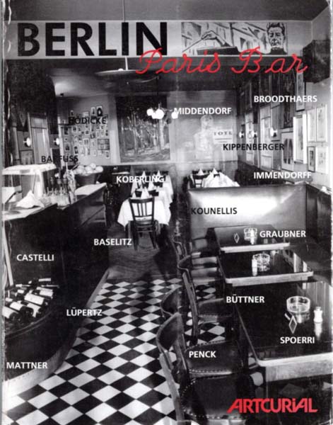 Berlin Paris Bar. Textes de Eckart Britsch, Heiner Müller, Hans Joachim Neyer, Oswald Wiener. Octobre – Novembre 1991. Artcurial. Centre d´art plastique contemporain, Paris. Erste Auflage. Paris. Artcurial. 1991. 27,4 x 21,2 cm. 126 S. OKarton mit OKlappenumschlag. Rücken berieben und lesespurig. Einbanddeckel etwas berieben und minimal angestaubt. Innen papierbedingt etwas nachgedunkelt. Sonst noch gutes Exemplar. Die Paris Bar war schon in den 50er und 60er Jahre eine Institution, nach der Übernahme durch Michel Würthle und Reinald Nohal 1979 war sie aber sicher der im Tend liegende kulturelle, künstlerische und kulinarische Fixpunkt im Westen des geteilten Berlin. Der Katalog verweist auf die Künstler, die die Bar oft zu einem Teil ihres Lebens machten, durch ihre allabendliche Präsenz und durch ihre dort verbliebenen Werke. Gezeigt werden neben Dokumenten und Fotos Arbeiten u.a. von Hödicke, Baselitz, Lüpertz, Immendorf, Büttner, Penck, Kippenberger, Kounellis, Spoerri etc. Texte in Französisch, angebunden eine deutsche Übersetzung auf rotem Papier.