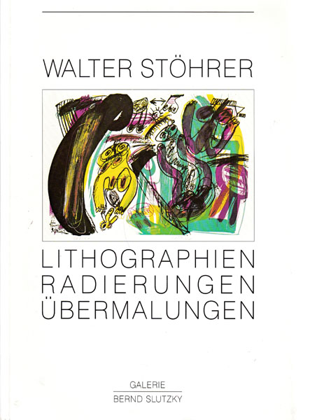 Stöhrer, Walter: Lithographien – Radierungen – Übermalungen. 1. Auflage. Frankfurt am Main. Galerie Bernd Slutzky. 1989. 24 x 17 cm. 57 S., 2 Blatt. Illustrierter OKarton. Einbandkanten etwas nachgedunkelt und mit kleinen Bereibungen. Sonst gutes bis sehr gutes Exemplar Zeigt druckgraphische Arbeiten Stöhrers. Mit 21 meist farbigen Abbildungen und 2 s/w Fotowiedergaben sowie einem Text von Ottmar Bergmann. Inliegend Preisliste.