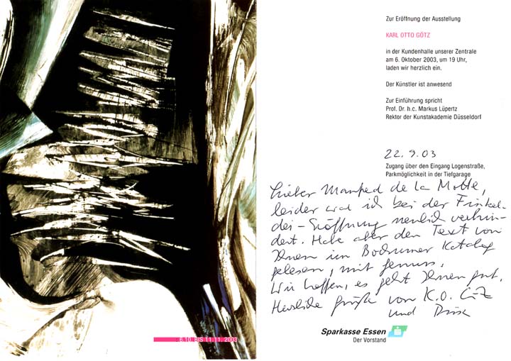 Götz, K. O. [und] Rissa: Handschriftliche Grußworte verso Einladungskarte. [Autograph]. Papier. Sehr gutes Exemplar. Handschriftliche Grußworte auf der Innenseite einer Klapp-Einladungskarte der Sparkasse Essen anlässlich einer Götz-Ausstellung von 2003 An den Freund und Kunstschriftsteller Manfred de la Motte, in der Handschrift von Rissa, 8 Zeilen, datiert 22.09.03.
