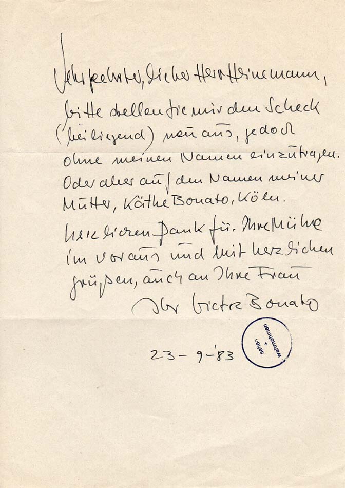 Bonato, Victor: Handschriftlicher Brief. 1 S. DIN A4. Gefaltet, gutes Exemplar. Handschriftlicher Brief an einen Sammler, 1 S. DIN A4, signiert, datiert 23.9.83 und mit Stempel „sehen – wahrnehmen“ versehen.