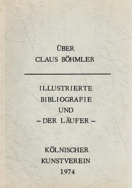 Böhmler, Claus: Über Claus Böhmler. Illustrierte Bibliographie und – Der Läufer. Zur Einzelausstellung im Kölnischen Kunstverein vom 21. November bis 31. Dezember 1974. 1. Auflage. Köln. Kölnischer Kunstverein. 1971. 21 x 16 cm. 120 S., 40 Blatt [Der Läufer]. OKarton. Sehr gutes Exemplar. Enthält ein bebildertes Werkverzeichnis und die Illustrationsfolge „Der Läufer“. Mit einem einführenden Text von Wulf Herzogenrath.
