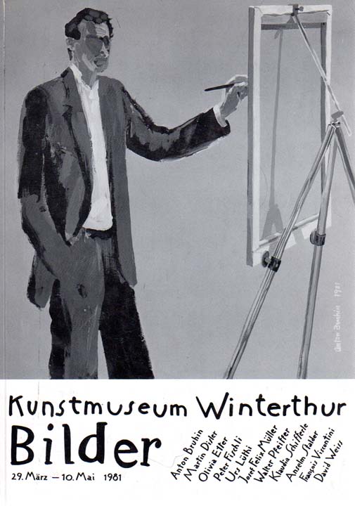 Bilder. Anton Bruhin – Martin Disler – Olivia Etter – Peter Fischli – Urs Lüthi – Josef Felix Müller – Walter Pfeiffer – Klaudia Schifferle – Anselm Stalder – Francois Viscontini – David Weiss. Kunstmuseum Winterthur 29. März bis 10. Mai 1981. Auflage 1000 Exemplare. Winterthur. Kunstmuseum. 1981. Ca. 180 unpagnierte S. OKarton. Sehr gutes Exemplar. Konzeptioneller Katalog. Durchgehend mit sschwarz-weiß Abbildungen versehen.