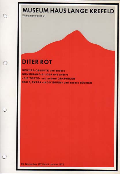 Rot, Diter: Gewürz-Objekte und andere / Gummiband-Bilder und andere / Die Torte udn andere Graphiken / BOK 3, Extra Individuum und andere Bücher. Museum Haus Lange, Krefeld. 25. November 1971 bis 9. Januar 1972. 1. Auflage. Krefeld. Museum Haus Lange. 1971. 32 x 26 cm. 16 lose Blatt mit Ringbuchschlaufenbindung. OKunststoff-Ringbuch. Gutes bis sehr gutes Exemplar. Erschien als Loseblattsammlung für das Ringbuch 5 des Museum Haus Lange. Mit einer Einführung von Paul Wember und mehreren Abbildungen, teils auf Klapptafeln. Hier als Einzellieferung im grünen Ringbuch Nummer 5.