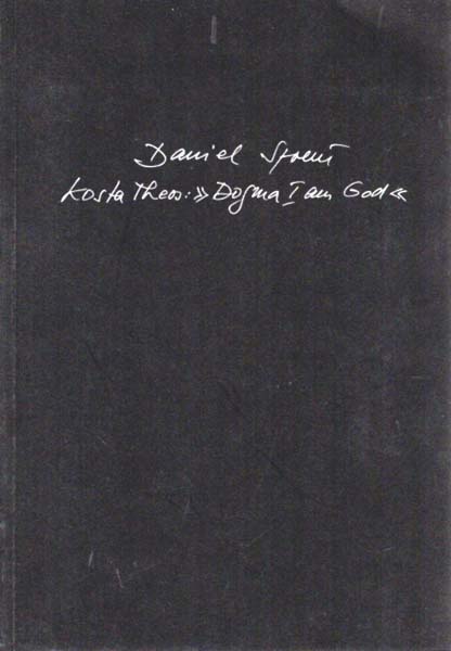 Spoerri, Daniel: Kosta Theos: Dogma I am God. Herausgegeben von Andre Kamber. Auflage 800 Exemplare. Bruxelles. Editions Lebeer-Hossmann. 1987. Groß 8°. 256 S. OKarton. Oberes Kapital leicht berieben, sonst sehr gutes Exemplar. Von Daniel Spoerri wie üblich zweifach in Rot und Blau auf dem Titelblatt handschriftlich signiert. Diese Publikation erschien am 29. August 1987 zur Eröffnung der Ausstellung „25 Objets de Magie a la Noix – Zimtzauberobjekte, angereichert mit 11 nicht konservierten Objekten und echt Zauberhaftem“ von Daniel Spoerri im Kunstmuseum Solothurn, zusammengestellt und herausgegeben von Andre Kamber. Erschien in 800 Exemplaren, wovon 175 als nummerierte und signierte Vorzugsausgabe mit einem Einband aus getragenen Kleidungsstücken Spoerris herausgegeben wurden.